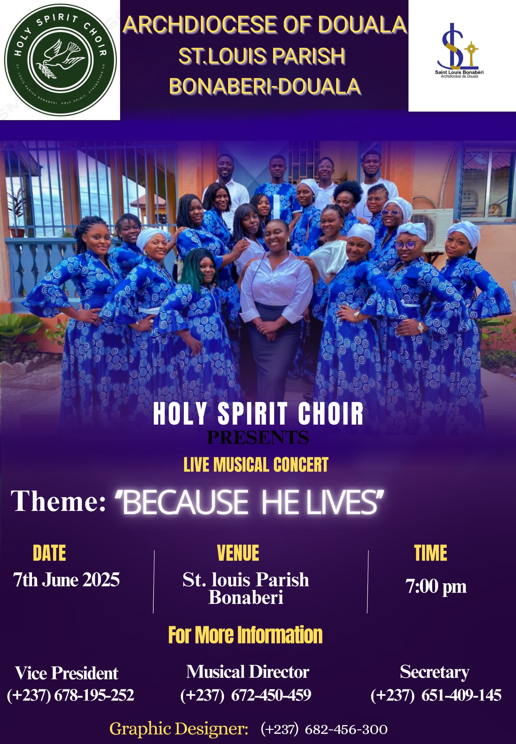 Holy Spirit Choir Concert Flyer. This flyer promotes a live musical concert organized by the Holy Spirit Choir of St. Louis Parish, Bonaberi, under the Archdiocese of Douala. The design features a formal purple background with gold and white text, reflecting a spiritual and professional tone. Central to the flyer is a group photo of the choir, creating a personal and inviting feel. It highlights key event details—theme, date, time, venue, and contact persons—for clarity. The glowing theme “Because He Lives” adds emotional impact. Overall, the flyer effectively communicates the event’s purpose and is ideal for community outreach and church bulletins